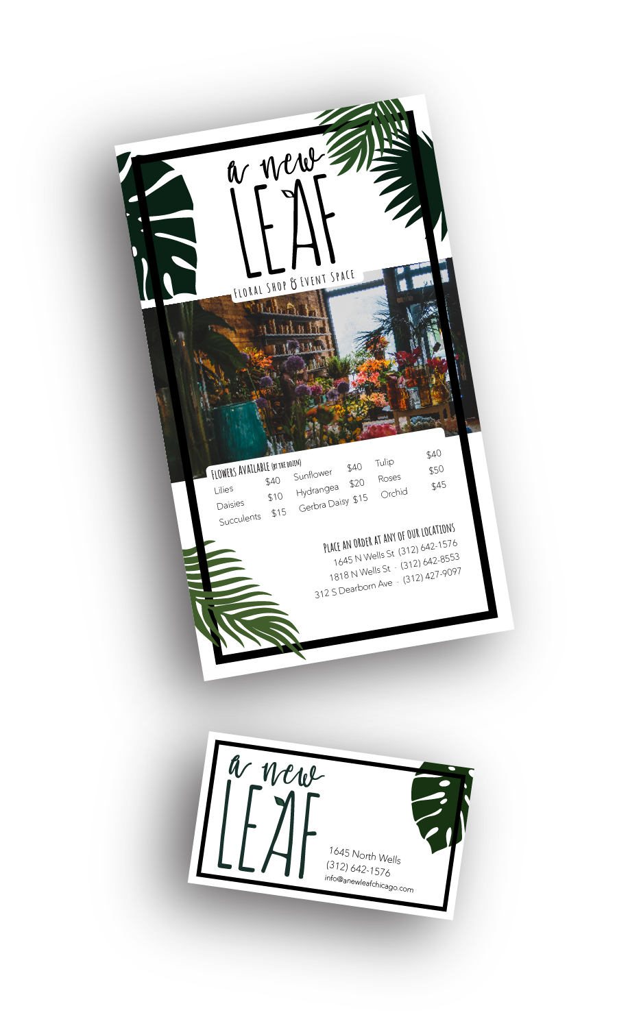 A hidden north Chicago gem,—A New Leaf is a multi-purpose business consisting of 3 floral shops and an event space with little brand identity. Their Event venue speaks loudly for their modern desire but lacks any essential branding materials. The little they do have is vastly out-of-date and adds no personality to this unique property. With multiple locations and business strategies, cohesive branding across all platforms will be essential in future growth