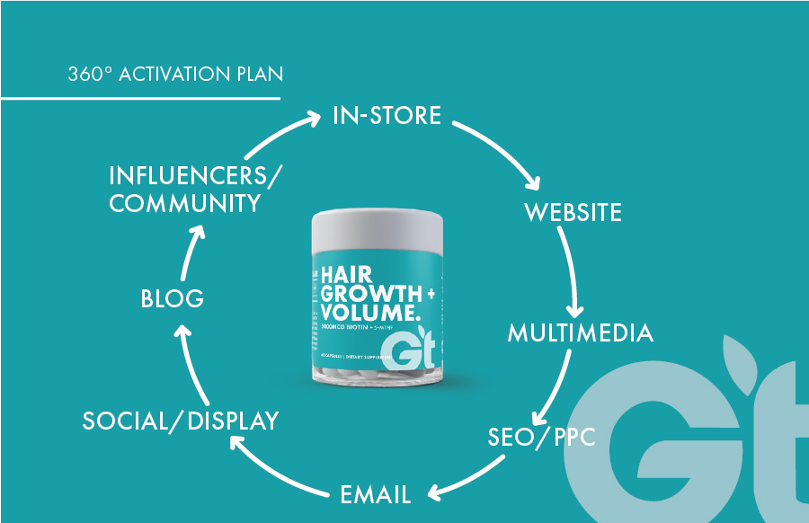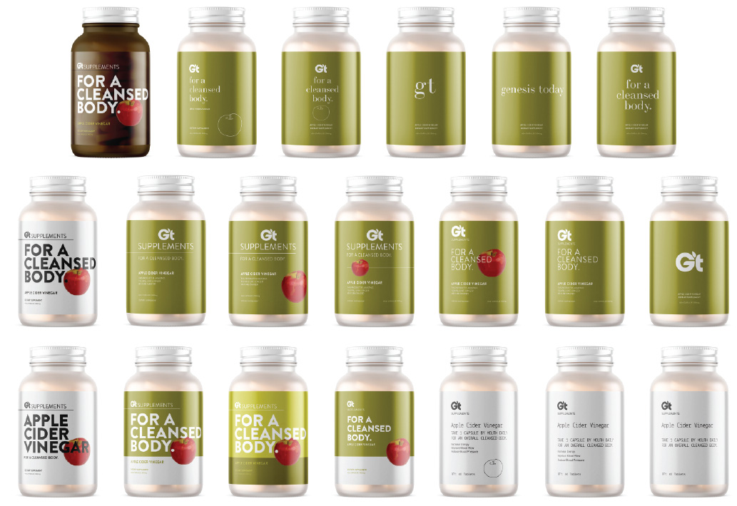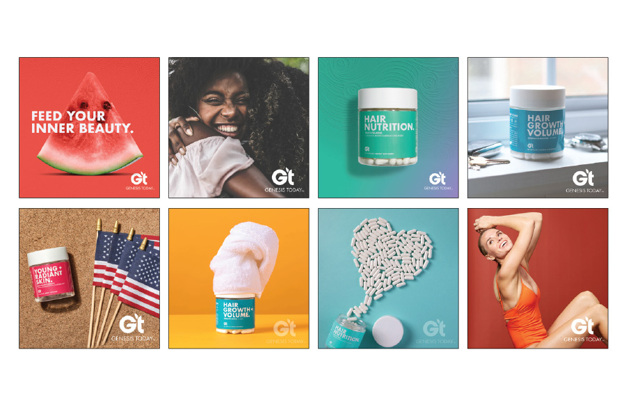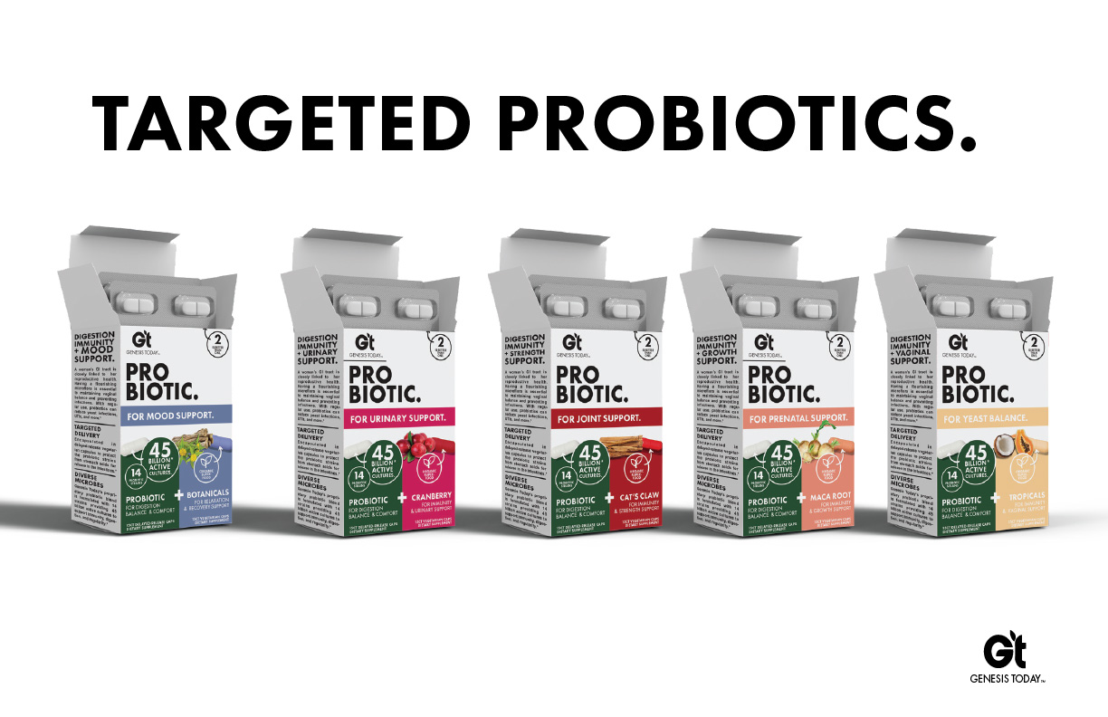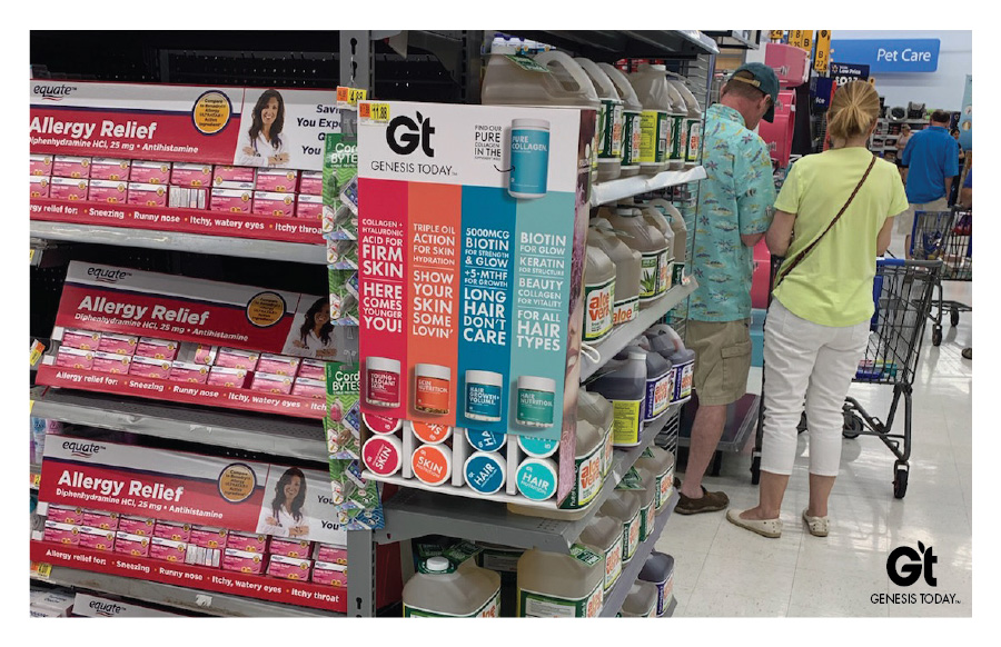When we took over the brand Genesis Today, it was a fresh slate to bring the existing company to modern times in design and product offerings. Along with a product developer, we repositioned the company into a 'Benefit-forward' concept that serves as a buildbord on shelves. Big bold font, vibrant color, and to-the-point positioning is what sets us apart in the now very contemporary industry.