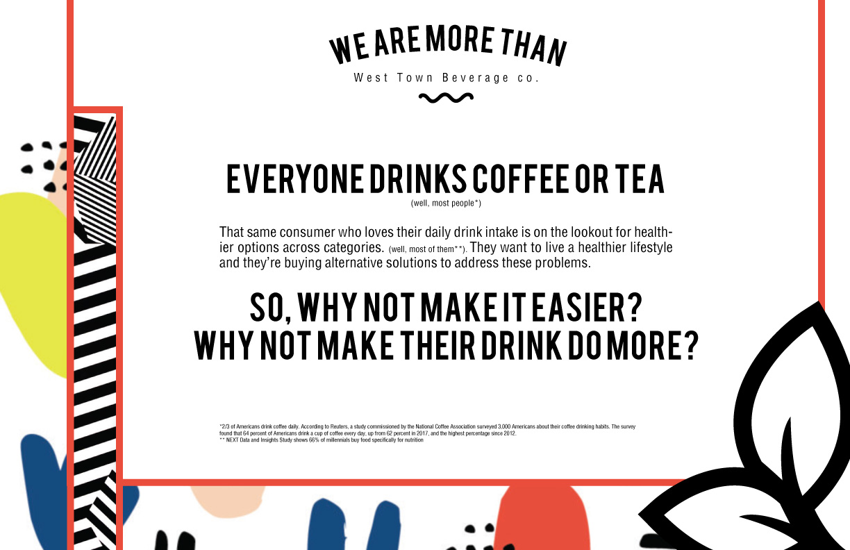 Starting off as a play in Genesis Today, this fun brand spun off into an area of its own. The concept was liquid digestible (aks dinks, which we may or may not have been able to call them!) that did 'more than' just satisfy thirst. Once leadership got ahold of the concept, new product requests came pouring in and design time was little to none. I feel the work we got out in such a short turn around was pretty productive!