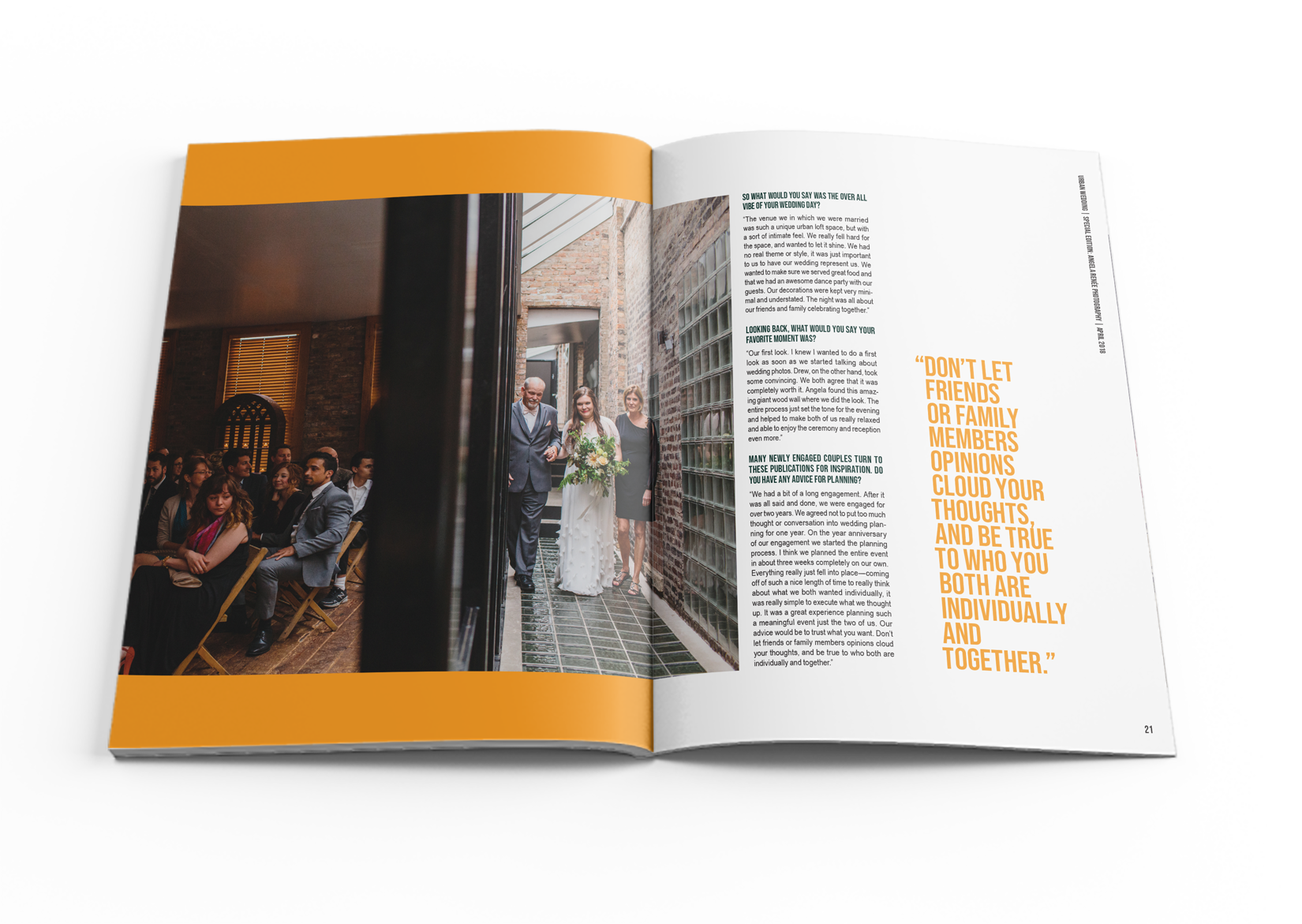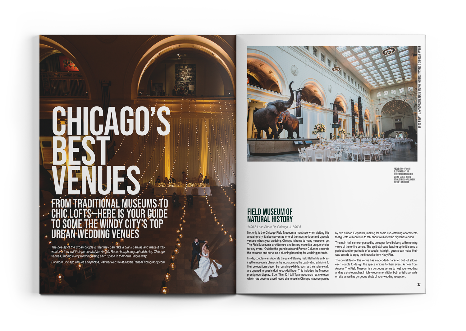 As a case study, I designed a full publication magazine called Urban Weddings. This issue is marked by a ‘Special Edition’ on Chicago-based wedding photographer Angela Renée, of Angela Renée Photography. The edition consists of a letter from the editor, two articles, 4 interviews, and a 10-plus page image feature.