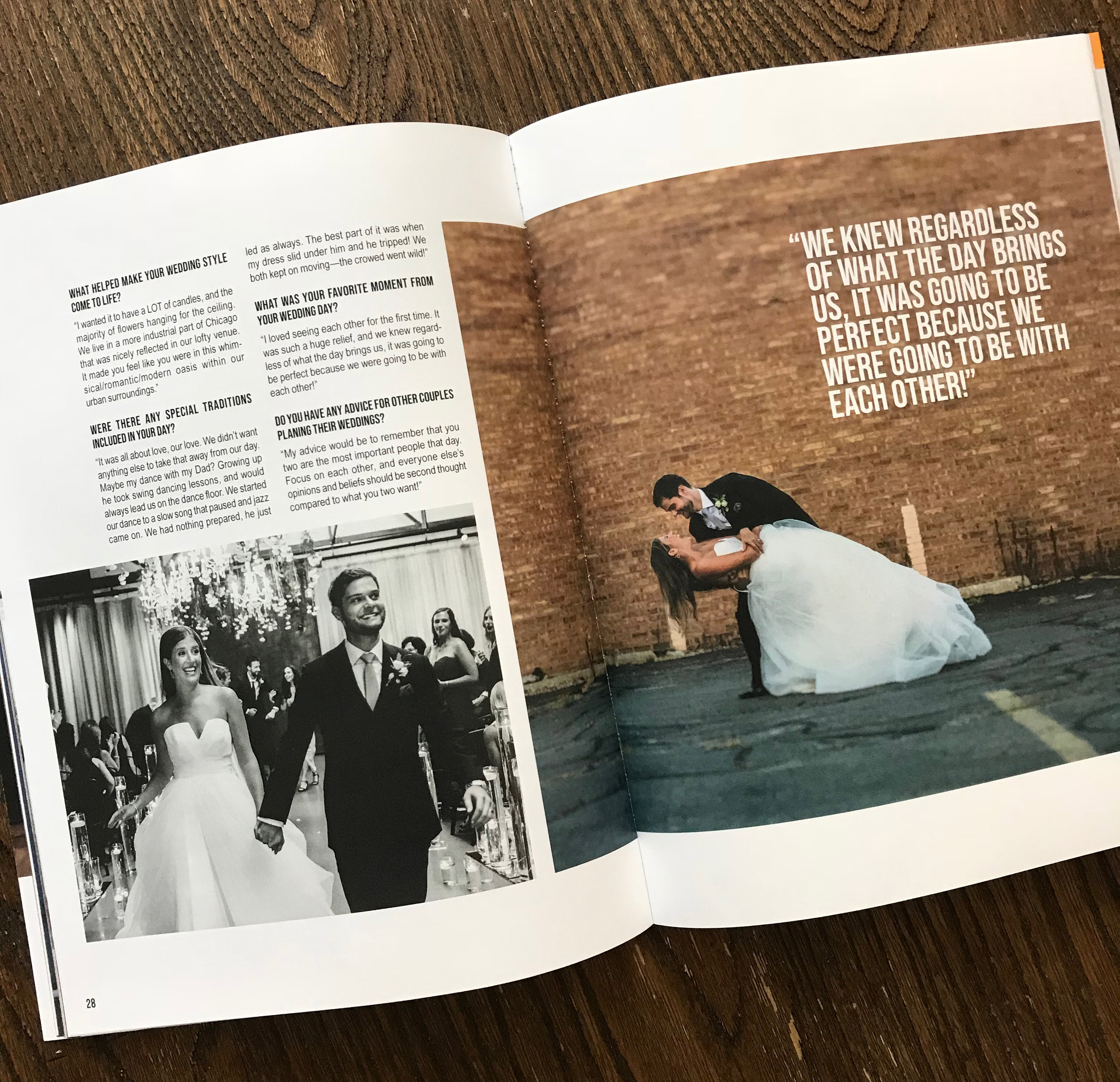 While a studio manager for two of Chicago's top wedding photographers, I had the opportunity to curate photos of their beautiful and candid work for external marketing. This also included gathering Q & A's from their couples to emphasize the candid ecstatic throughout their blog material. With all these images and a great amount of detailed wedding-planning advice, I created a 40-plus page publication on urban style weddings as an output of this awesome information. The wedding industry is constantly calling for real-life material that my employer had a abundant amount of!