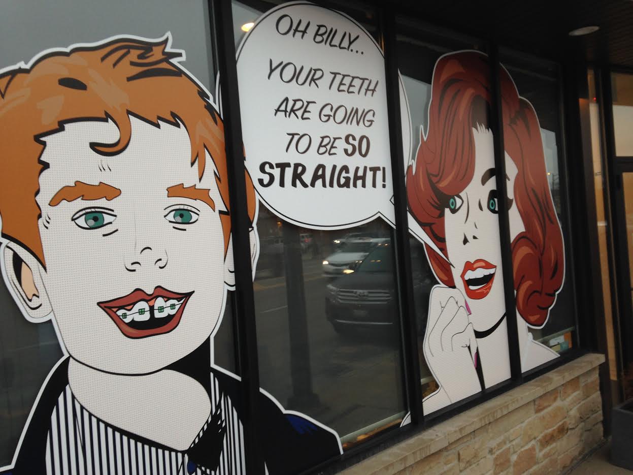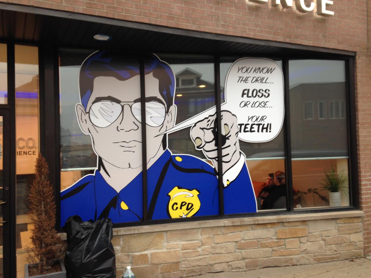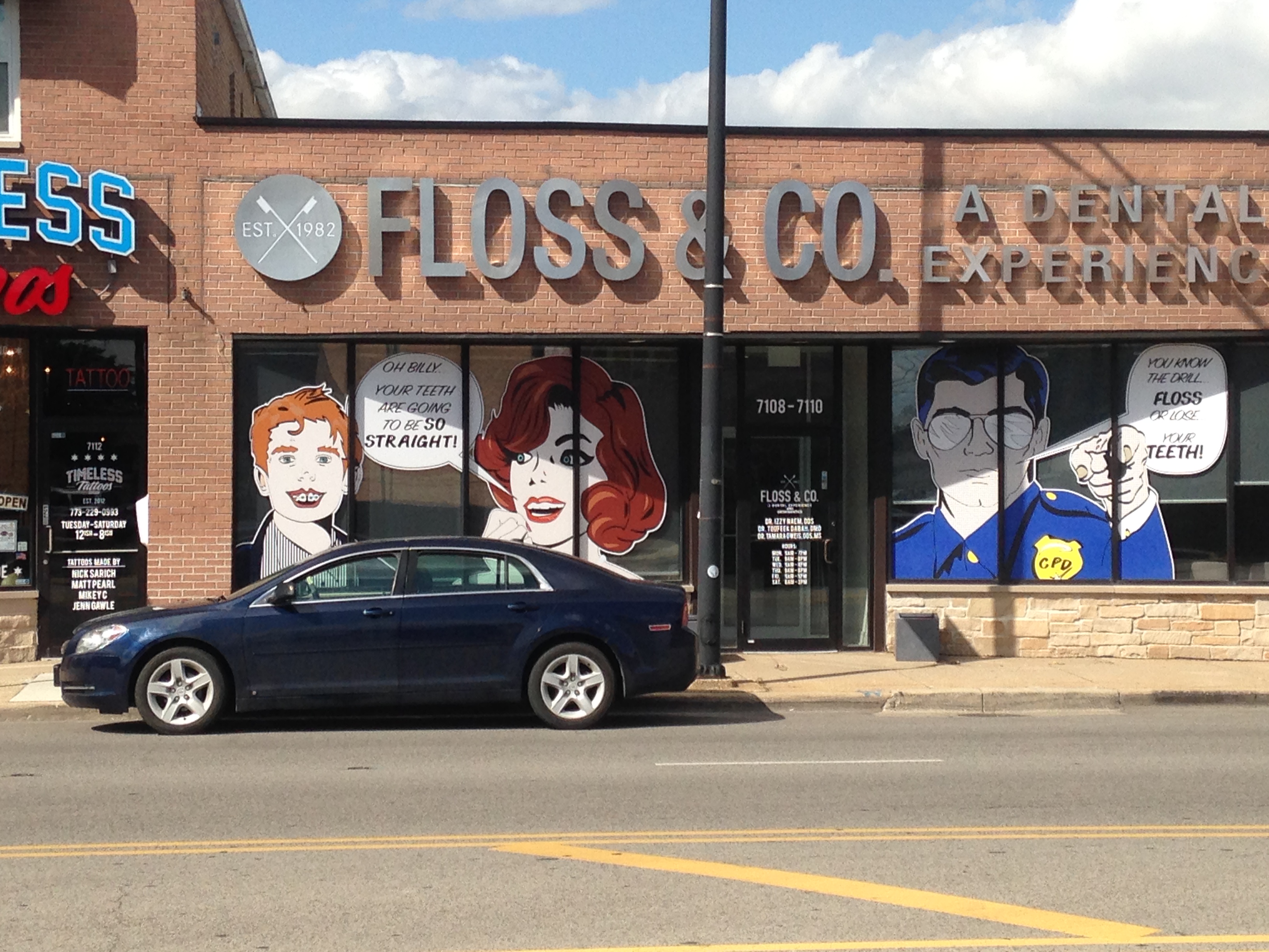 Boutique dentistry has become an interesting industry in Chicago. Many offices embrace a desire for creativity to stand out in what seems to be a competitive market. One dentist, in particular, seemed to exceed the rest. I had the pleasure of meeting Dr. Izzy Neam of Floss & Co. a few years ago, without realizing it was the start of a long term creative partnership. He is a forward thinker even outside of the mouth! The designs below come from his first request of window designs to decorate his large front real estate that faces a heavy traffic road, as he had identified the ability to use this as an attention-grabbing marketing tool. He wanted to, of course, speak to his companies focus, but also use this as a place to display artwork and bring beauty to the growing, family-oriented area.