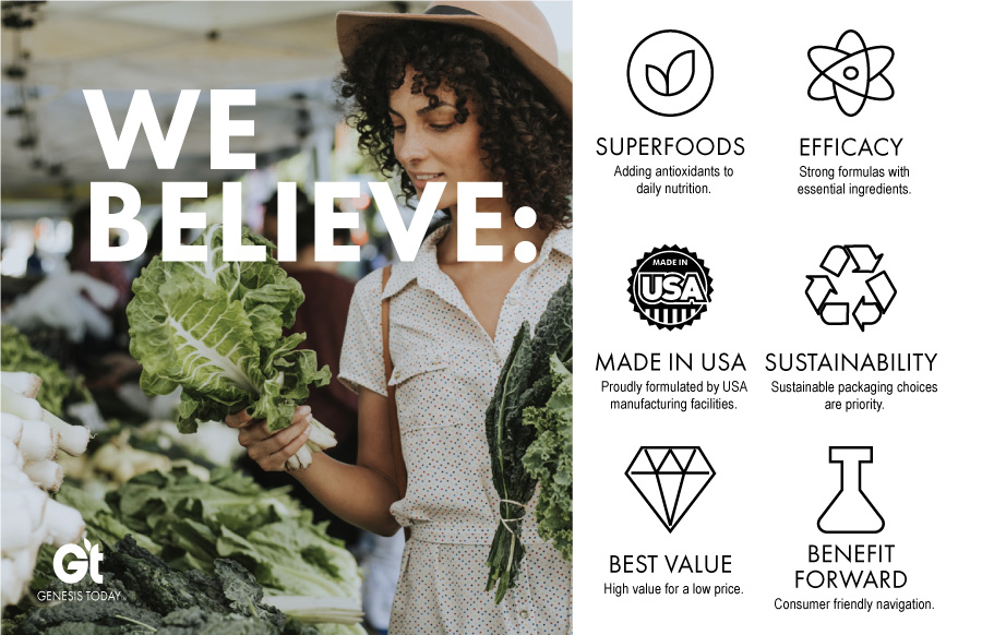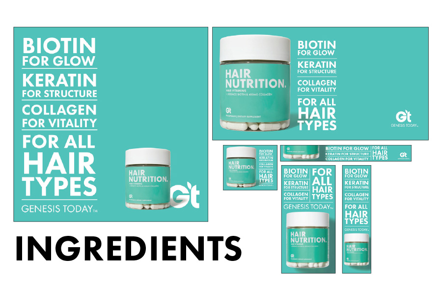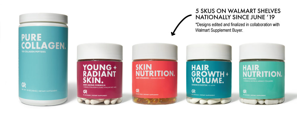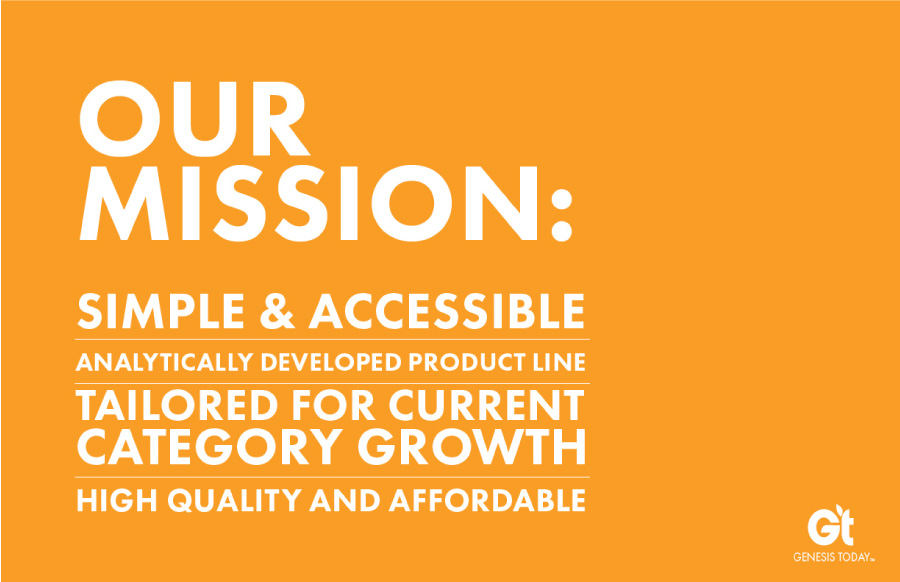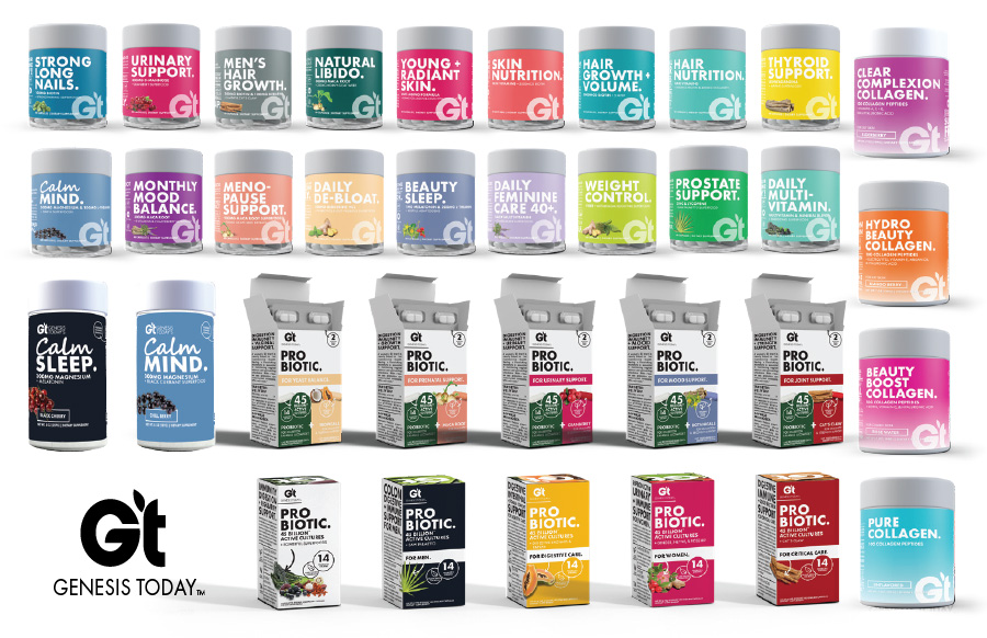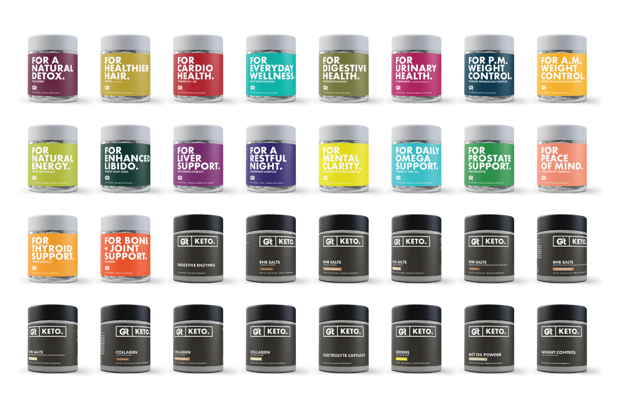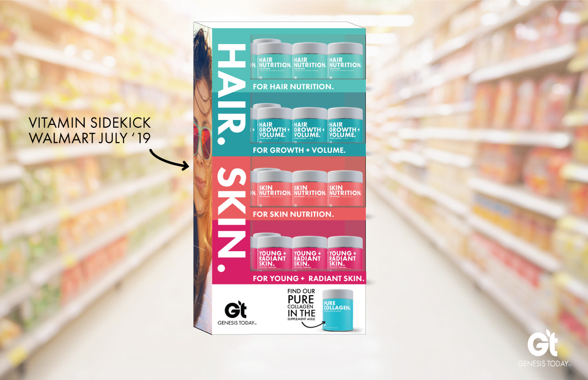 When we took over the brand Genesis Today, it was a fresh slate to bring the existing company to modern times in design and product offerings. Along with a product developer, we repositioned the company into a 'Benefit-forward' concept that serves as a buildbord on shelves. Big bold font, vibrant color, and to-the-point positioning is what sets us apart in the now very contemporary industry.