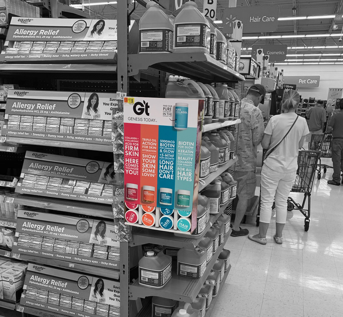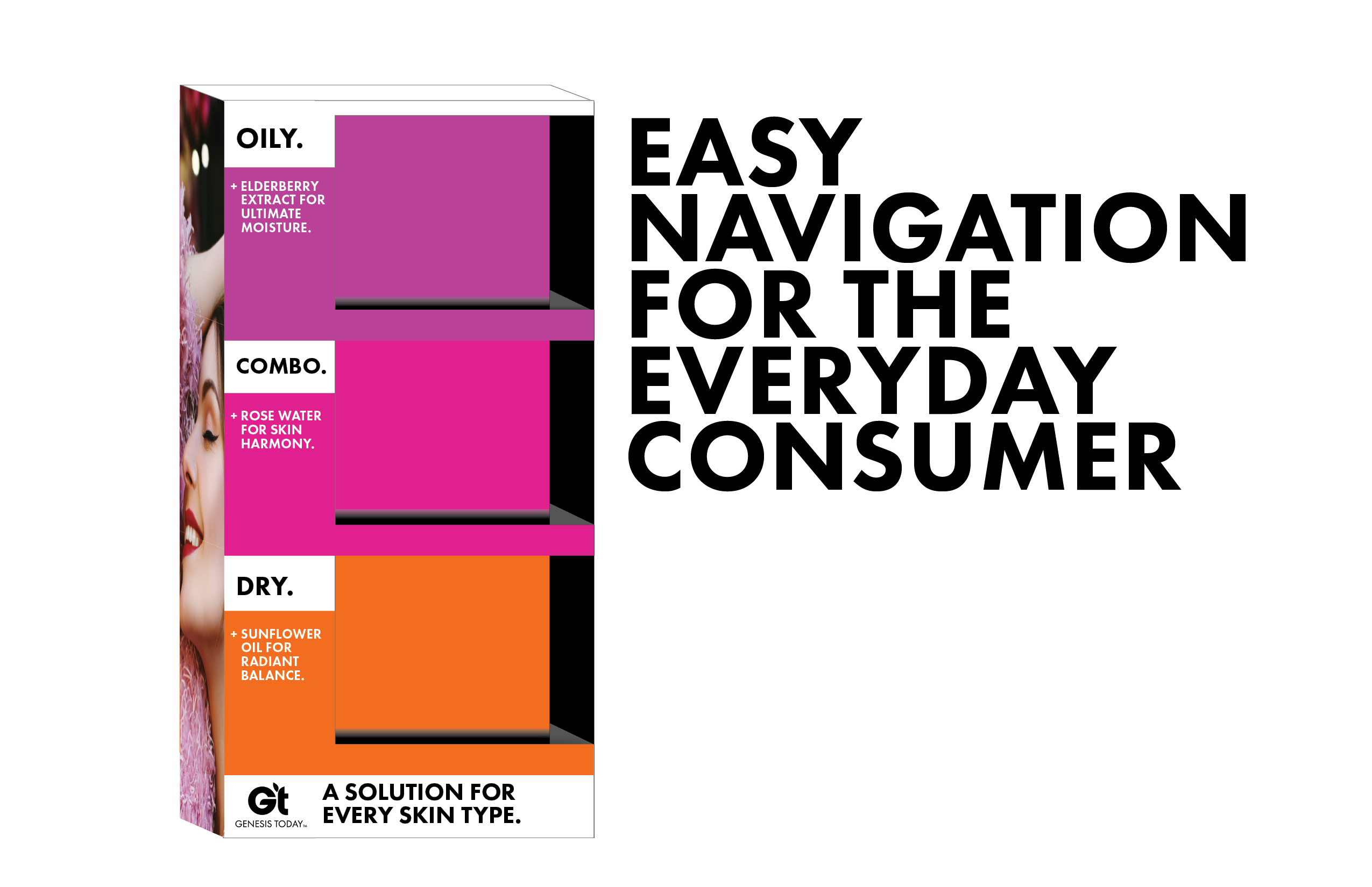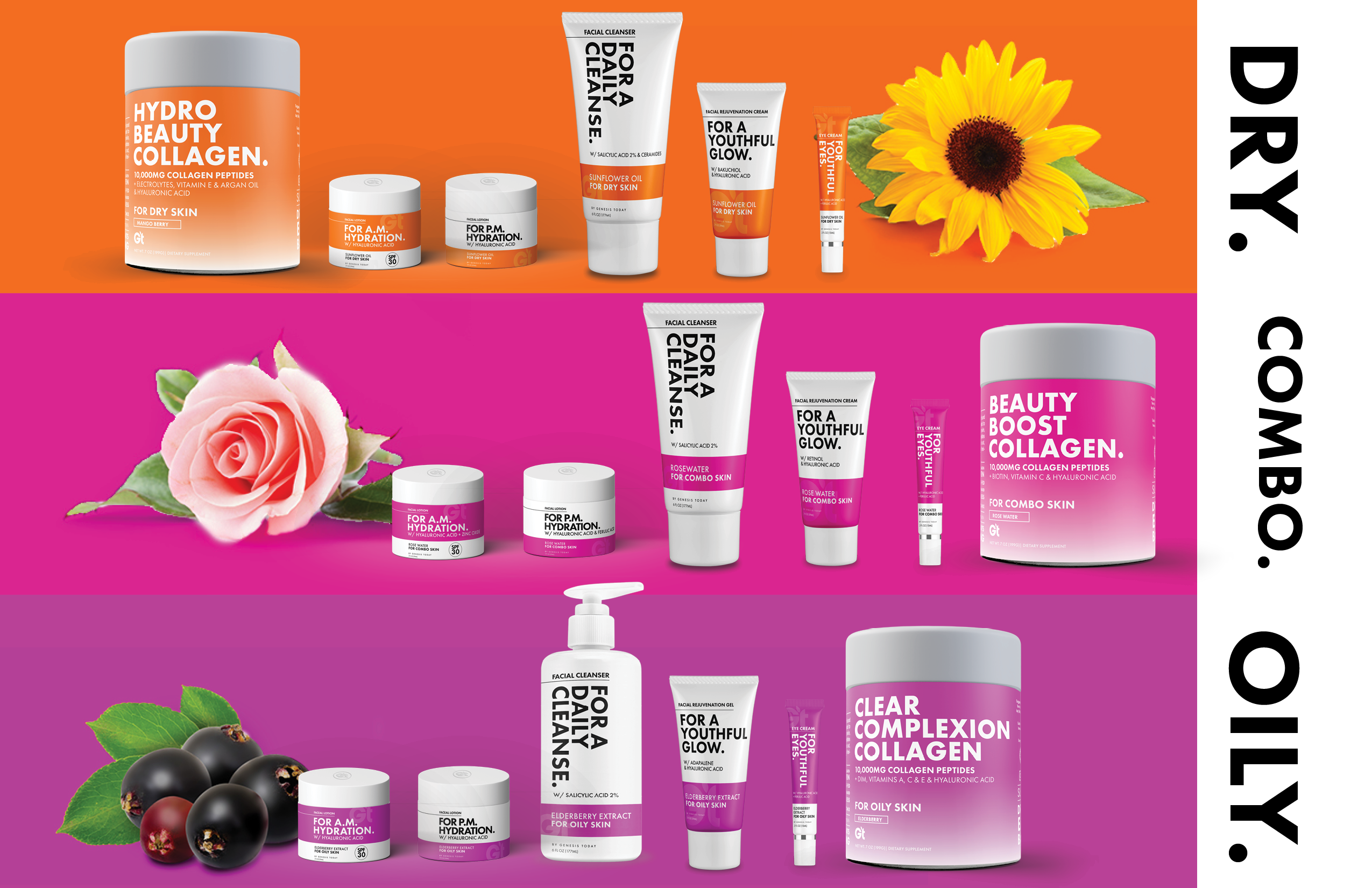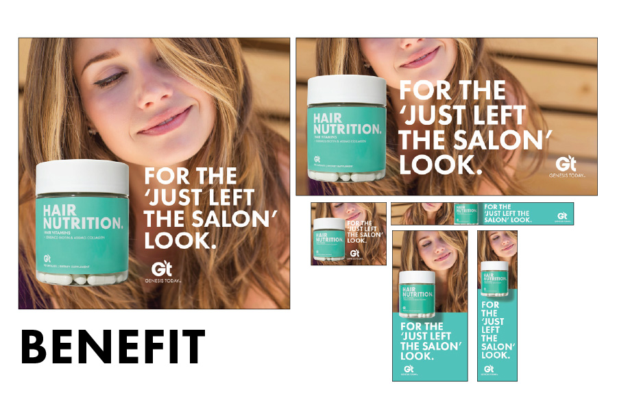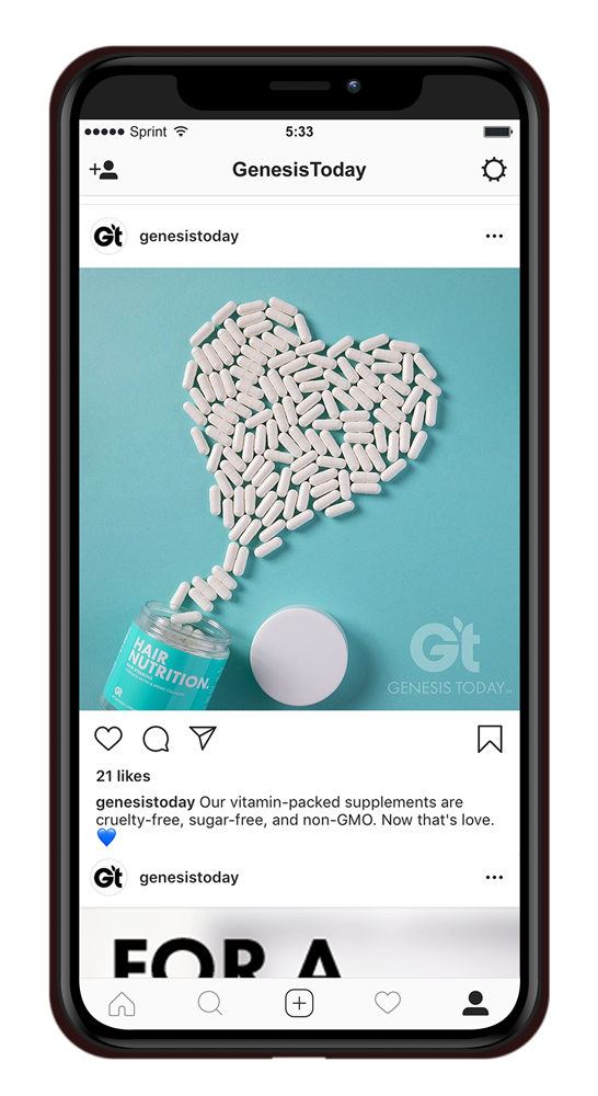 When we took over the brand Genesis Today, it was a fresh slate to bring the existing company to modern times in design and product offerings. Along with a product developer, we repositioned the company into a 'Benefit-forward' concept that serves as a buildbord on shelves. Big bold font, vibrant color, and to-the-point positioning is what sets us apart in the now very contemporary industry.