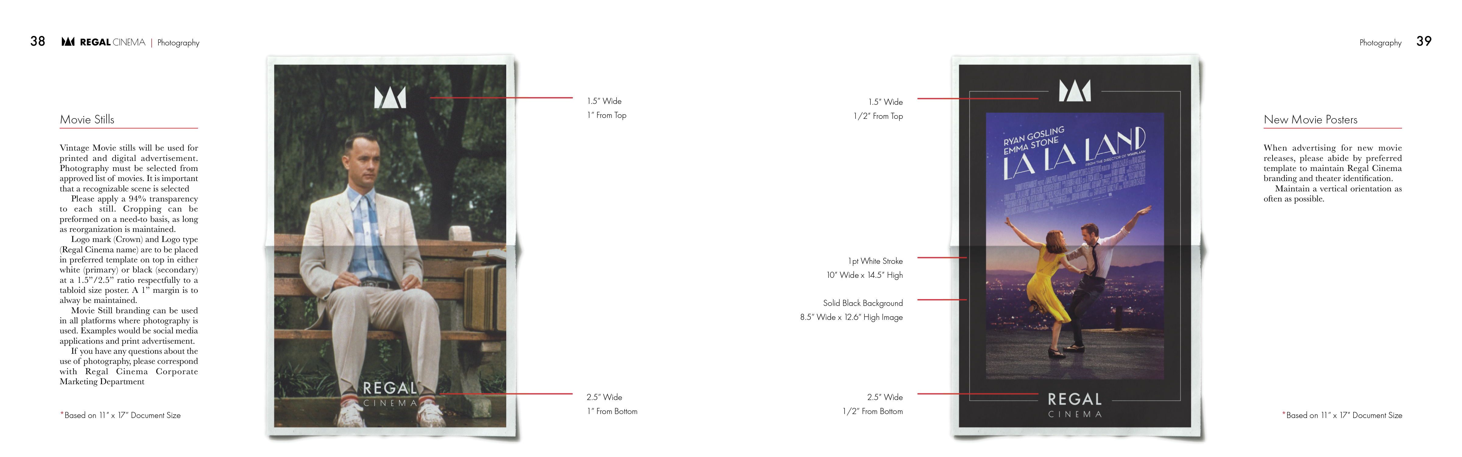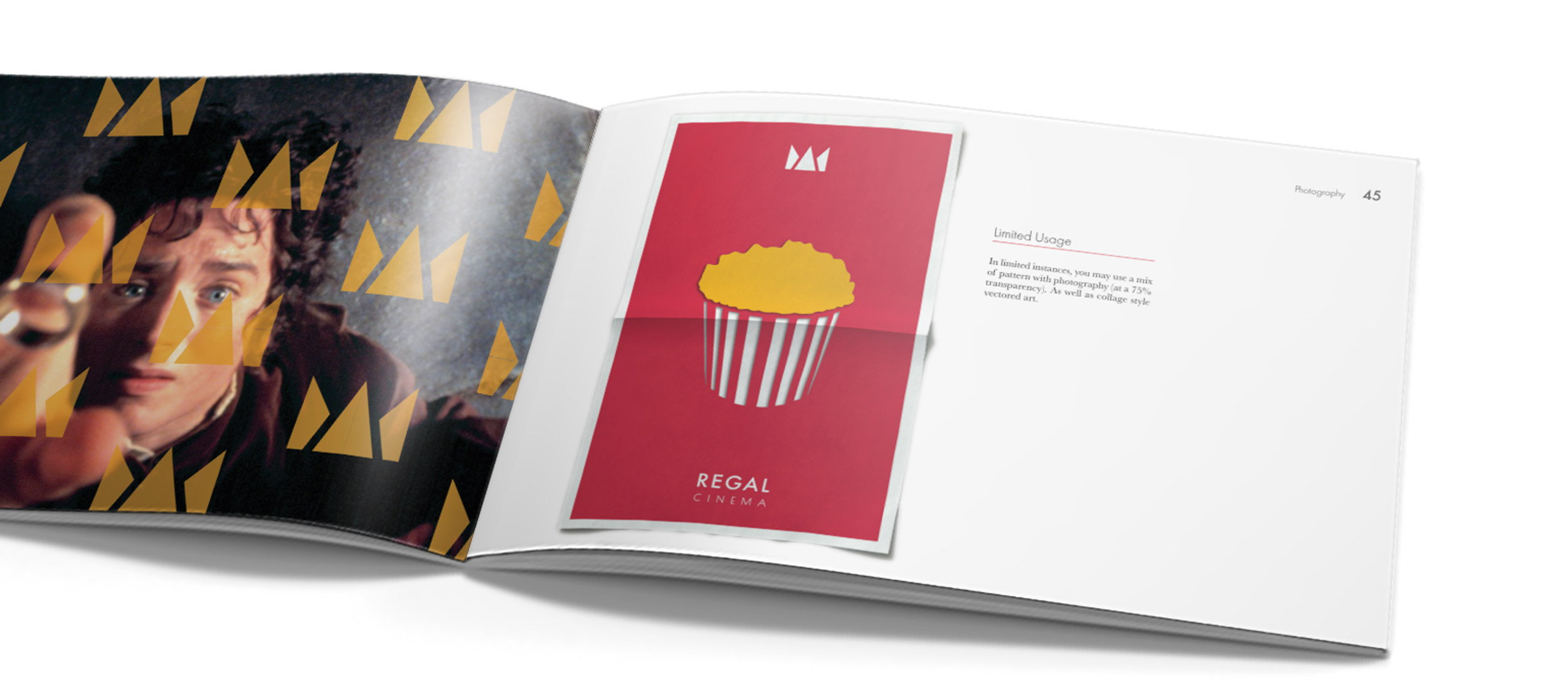 As a case study, I gave this theater, that was once stuck in its founding year, a new and modern facelift! The new primary mark is represented in black and white; while color, pattern, and photography is used as a powerful design accent. It is important that the logo stands alone, yet it does not distract from the emotion and nostalgia of the movies and movie viewing experience. Photography, especially, is one of Regal’s new branding's most important design element. The logo being a location reminder of where they can feel the emotion of each photo—at the theater! The over-all re-brand has given Regal an up-scale feel, with simplicity. Allowing the theater to do what it does best- create memories, emotion, and joy!