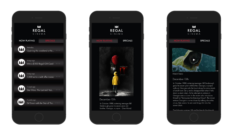 Regal Cinema has grown to become the 2nd largest theater chain in America. Since their foundation in the late 1980s, they have not updated their logo-mark to depict the innovations they are leading the competition in. With my process of their re-brand, I felt it was important to communicate what the movies are to a viewer.