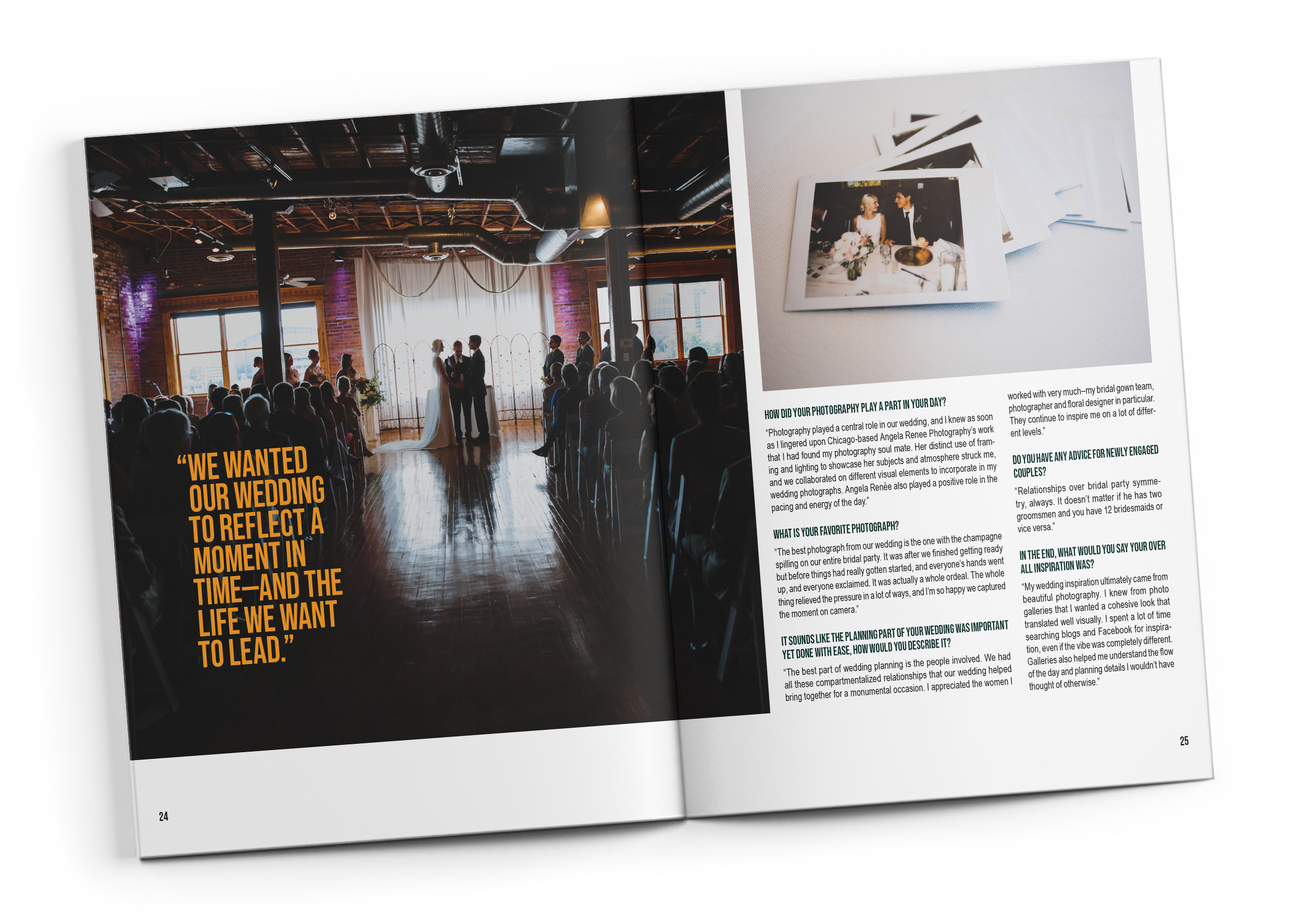 While a studio manager for two of Chicago's top wedding photographers, I had the opportunity to curate photos of their beautiful and candid work for external marketing. This also included gathering Q & A's from their couples to emphasize the candid ecstatic throughout their blog material. With all these images and a great amount of detailed wedding-planning advice, I created a 40-plus page publication on urban style weddings as an output of this awesome information. The wedding industry is constantly calling for real-life material that my employer had a abundant amount of!