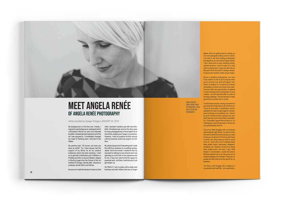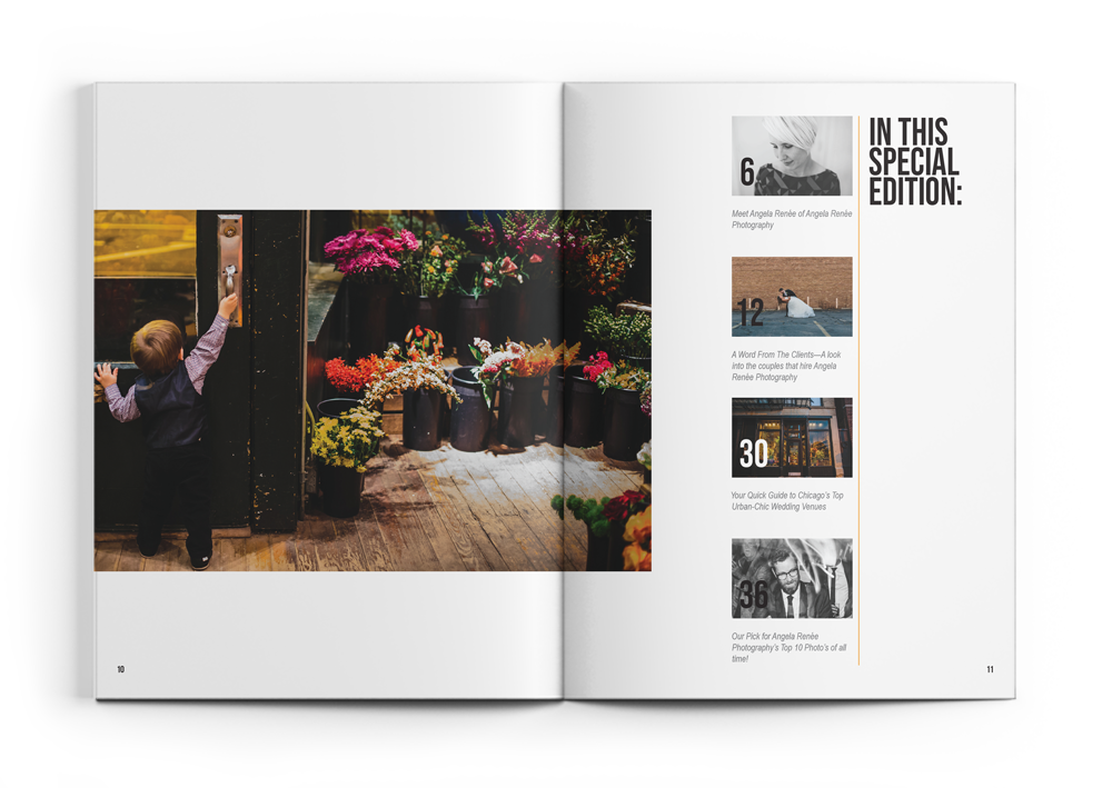 As a case study, I designed a full publication magazine called Urban Weddings. This issue is marked by a ‘Special Edition’ on Chicago-based wedding photographer Angela Renée, of Angela Renée Photography. The edition consists of a letter from the editor, two articles, 4 interviews, and a 10-plus page image feature.